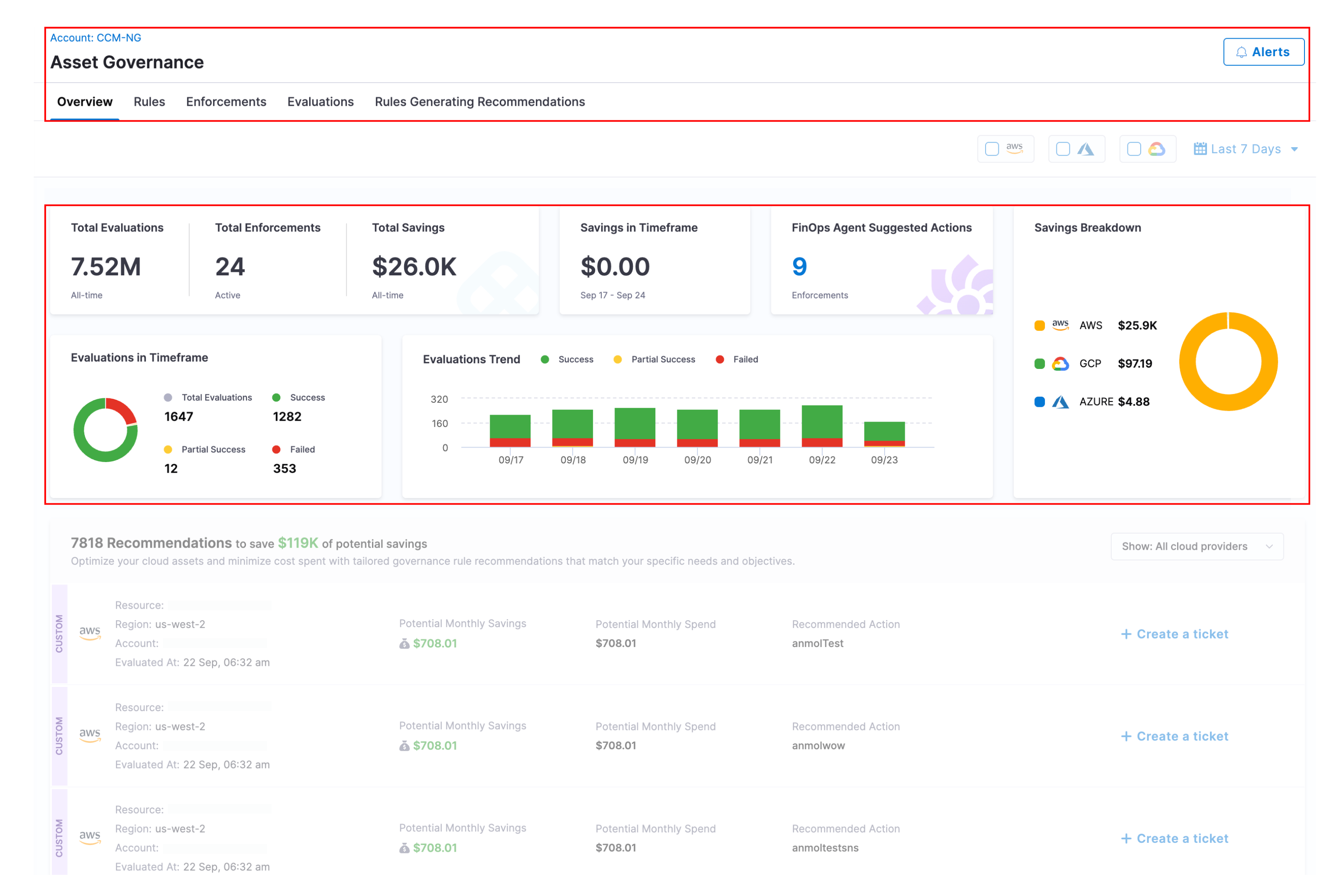 - Alerts : Alerts allow you to receive notifications when certain conditions are met during governance evaluations. These conditions can be fine-tuned based on cloud providers, resource types, account/subscription/project , cost impact, and resource count.