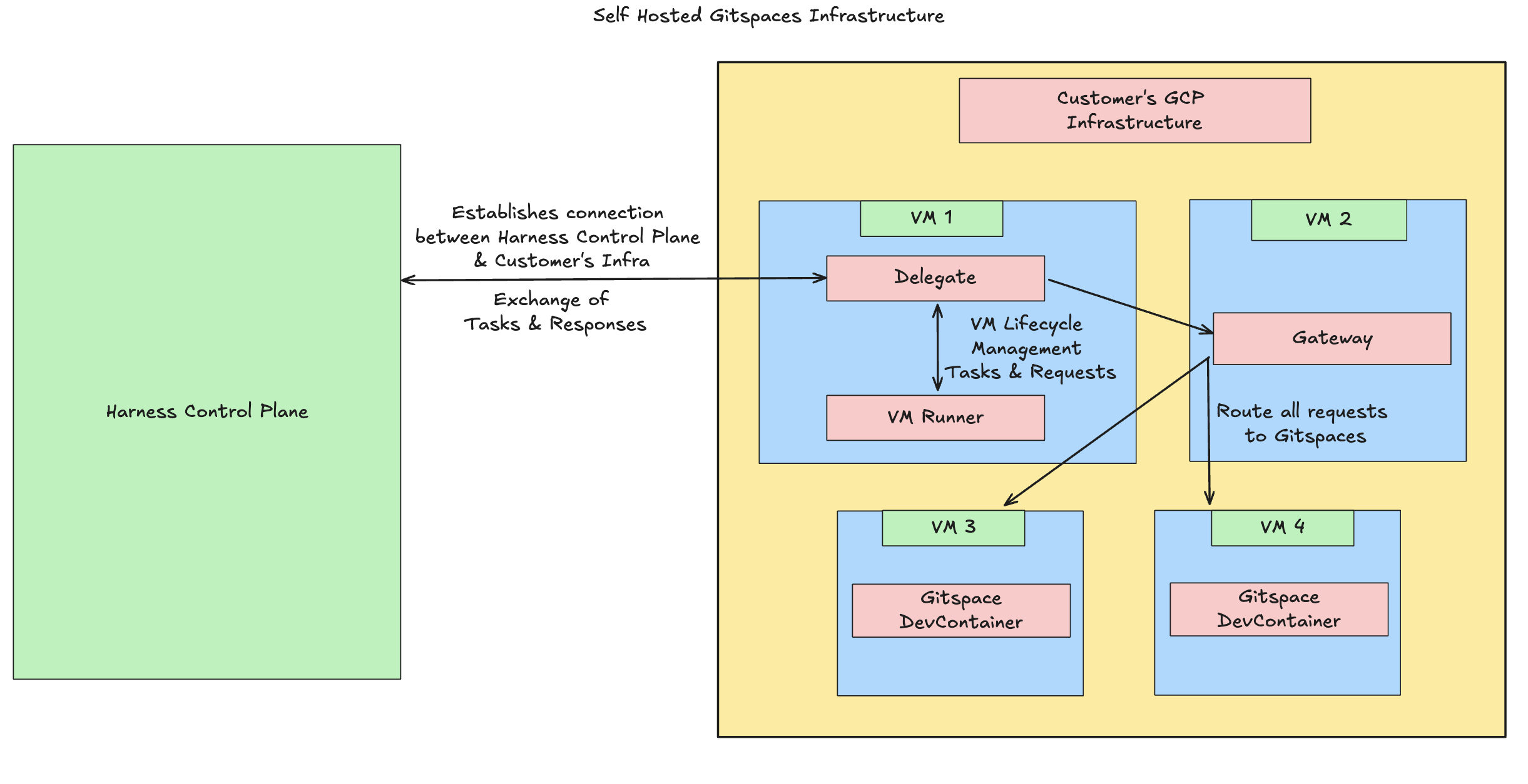 This section explains the key functions of Harness Delegate and VM Runner. Refer to Self Hosted Gitspaces Architecture to understand the underlying architecture in detail.