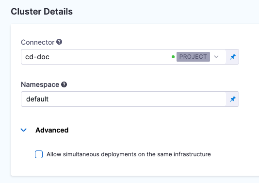 Back in Cluster Details, in Namespace, enter the target namespace for the deployment. For example, default. You can use any namespace in your target cluster.