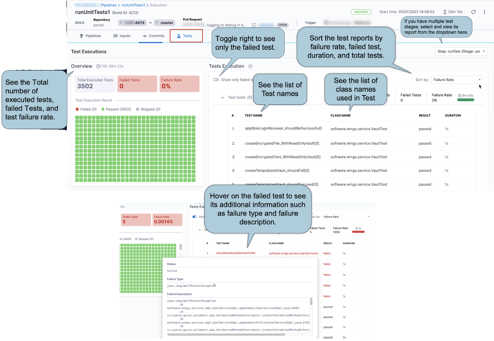 Expand the sections below to learn more about the information available on the Tests tab for Test Intelligence.