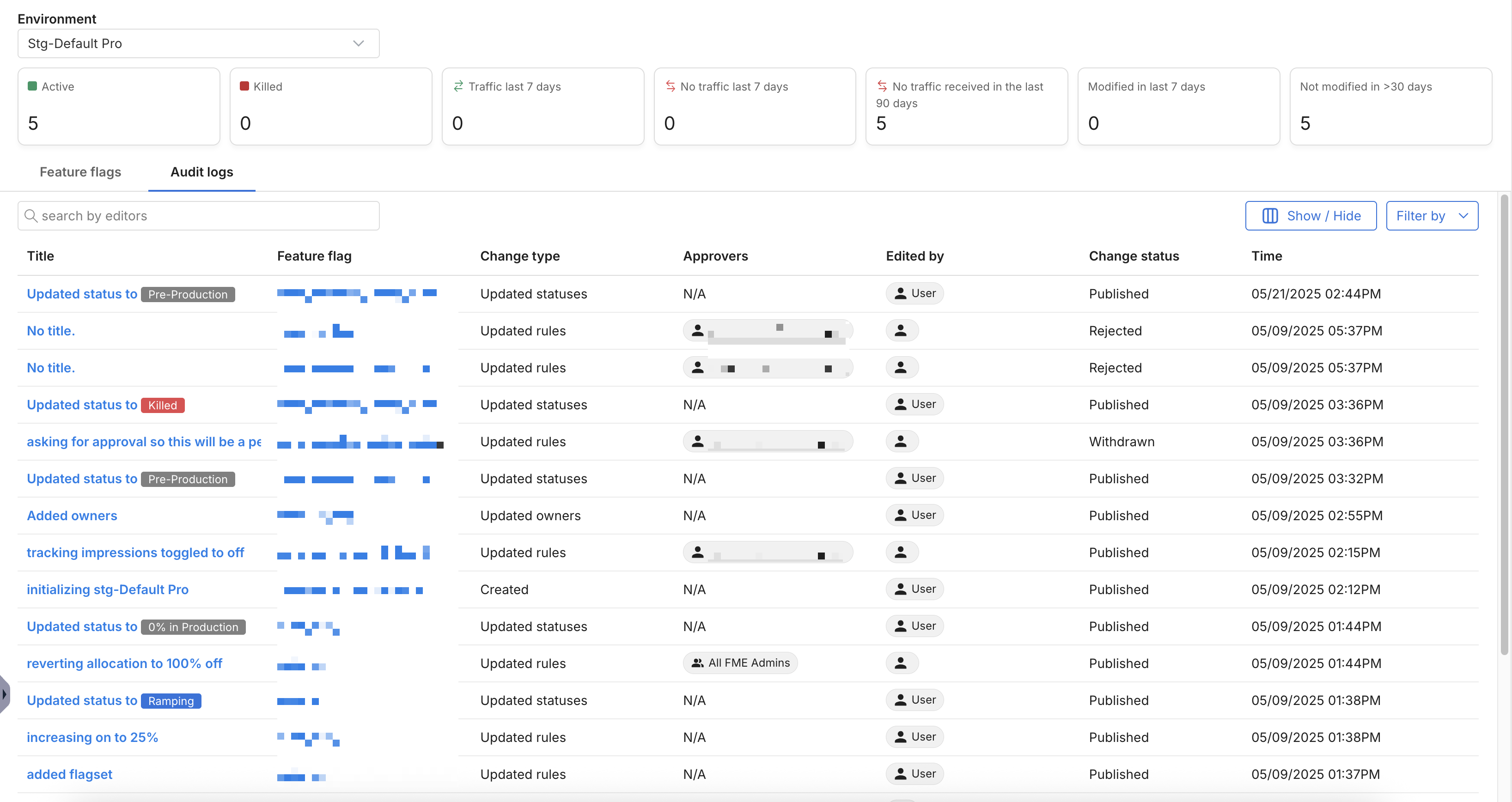The environment-level audit log lists all changes made to feature flags within an environment. It’s similar to the Audit log tab found in each feature flag; however, it allows you to see all changes without visiting each feature flag separately. It also supports sophisticated filtering, for example, whether a feature flag has had traffic in the last seven days, hasn’t been modified in more than 30 days, etc.