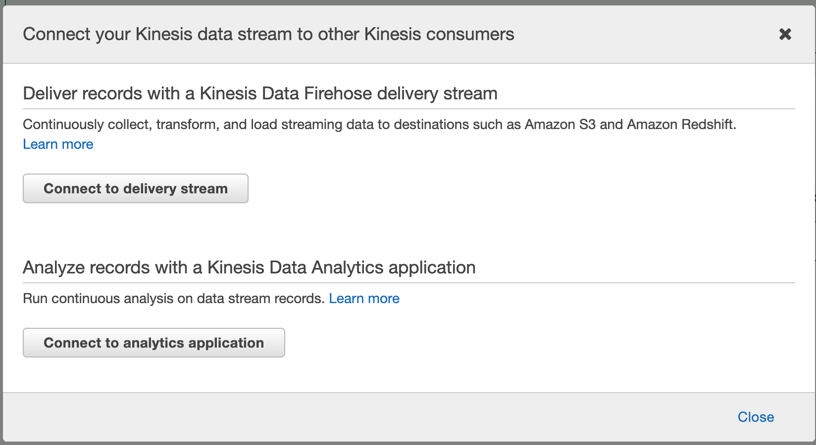 3. Once the Kinesis Stream is created, select its record and click Connect Kinesis consumers.