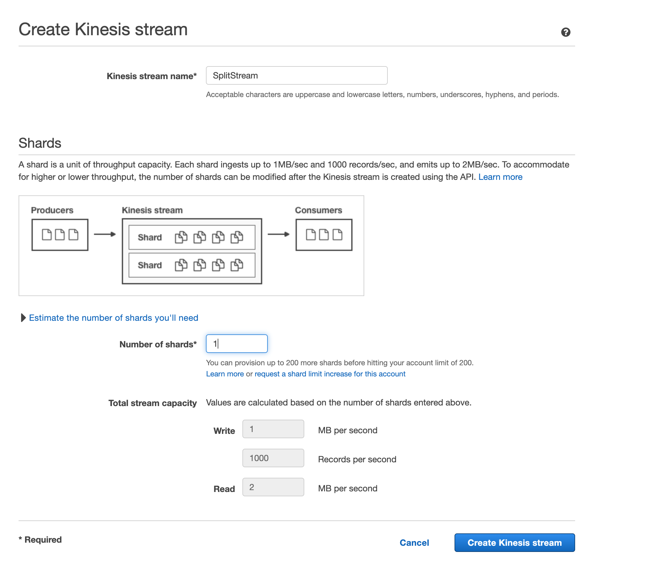 2. Put the service name, specify the shards number based on the amount of impressions generated, consult an AWS expert for more info on shards, and click Create Kinesis stream.