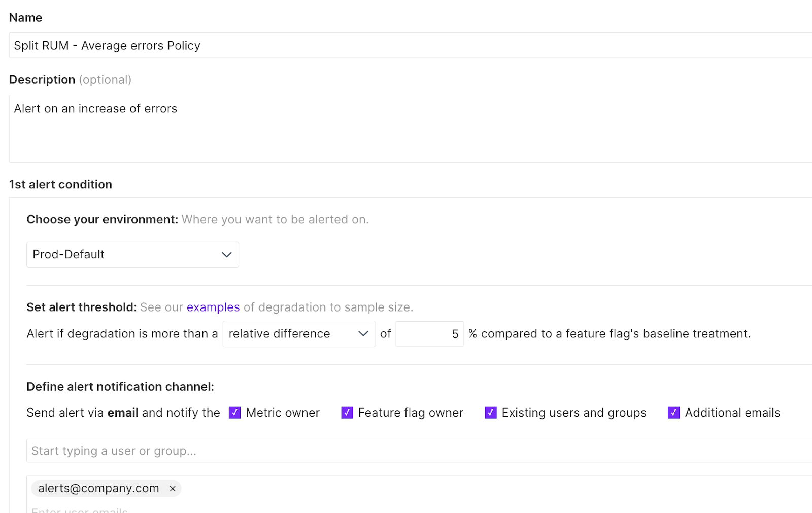 Feature flag alerting immediately notifies you when a feature flag key metric achieves significance, allowing you to have confidence in the impact of your new feature. Alert policies will alert you immediately to a guardrail metric being hit, ensuring that service degradations can be acted upon swiftly.