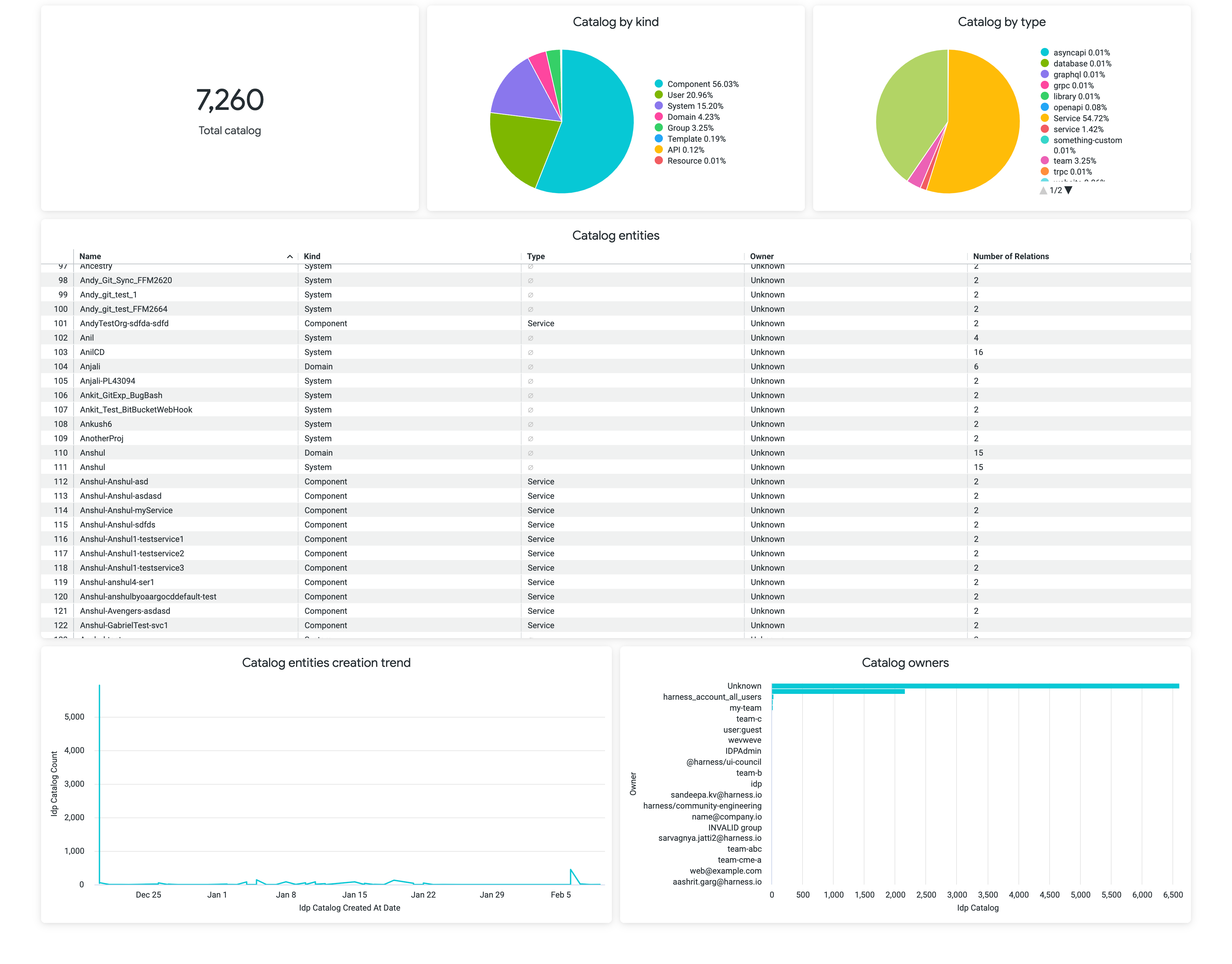 1. Dashboard describing the state of catalog, which includes, Number of registered entities, catalog kind and type.