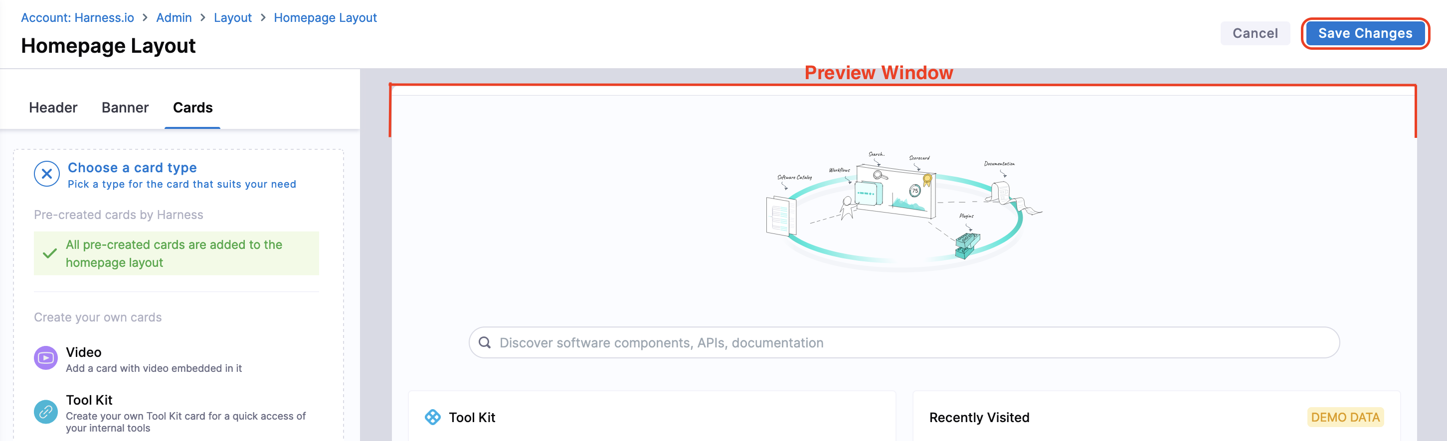 The Platform Admins can customize the homepage under Layouts for 3 different categories Header, Banner and Cards. A preview of the changes with sample data is available while customizing the homepage. The cards can be of two width sizes, i.e., medium(6md) and large(12md).