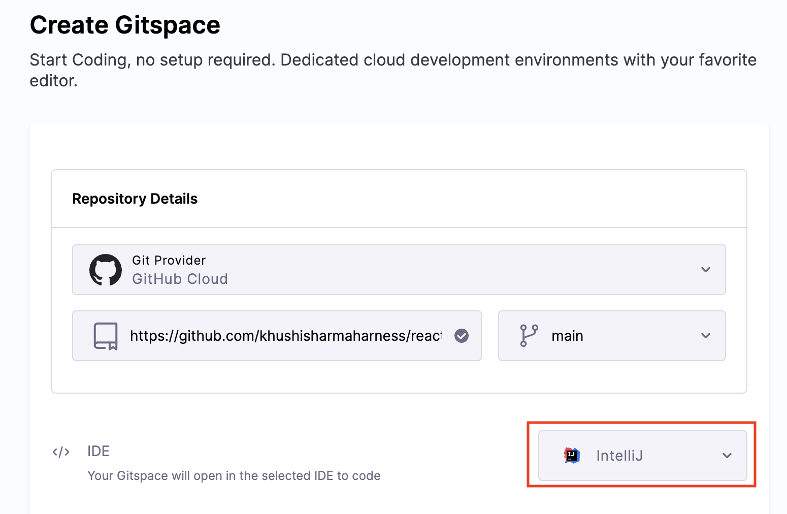2. Select "IntelliJ" as the IDE during Gitspace creation.