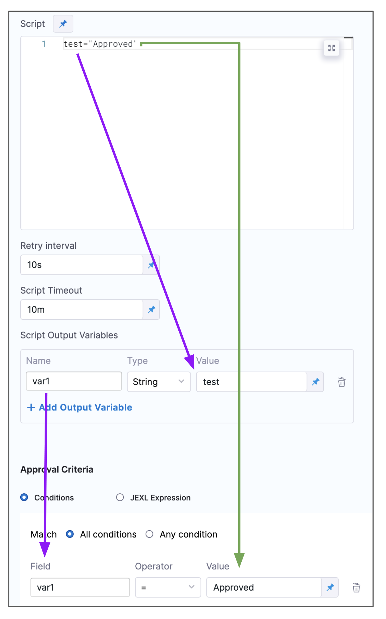 First, you create the variable in Script, then create a variable in Script Output Variables that references that variable, and then use the Script Output Variables variable and the Script variable's value in the Approval Criteria: