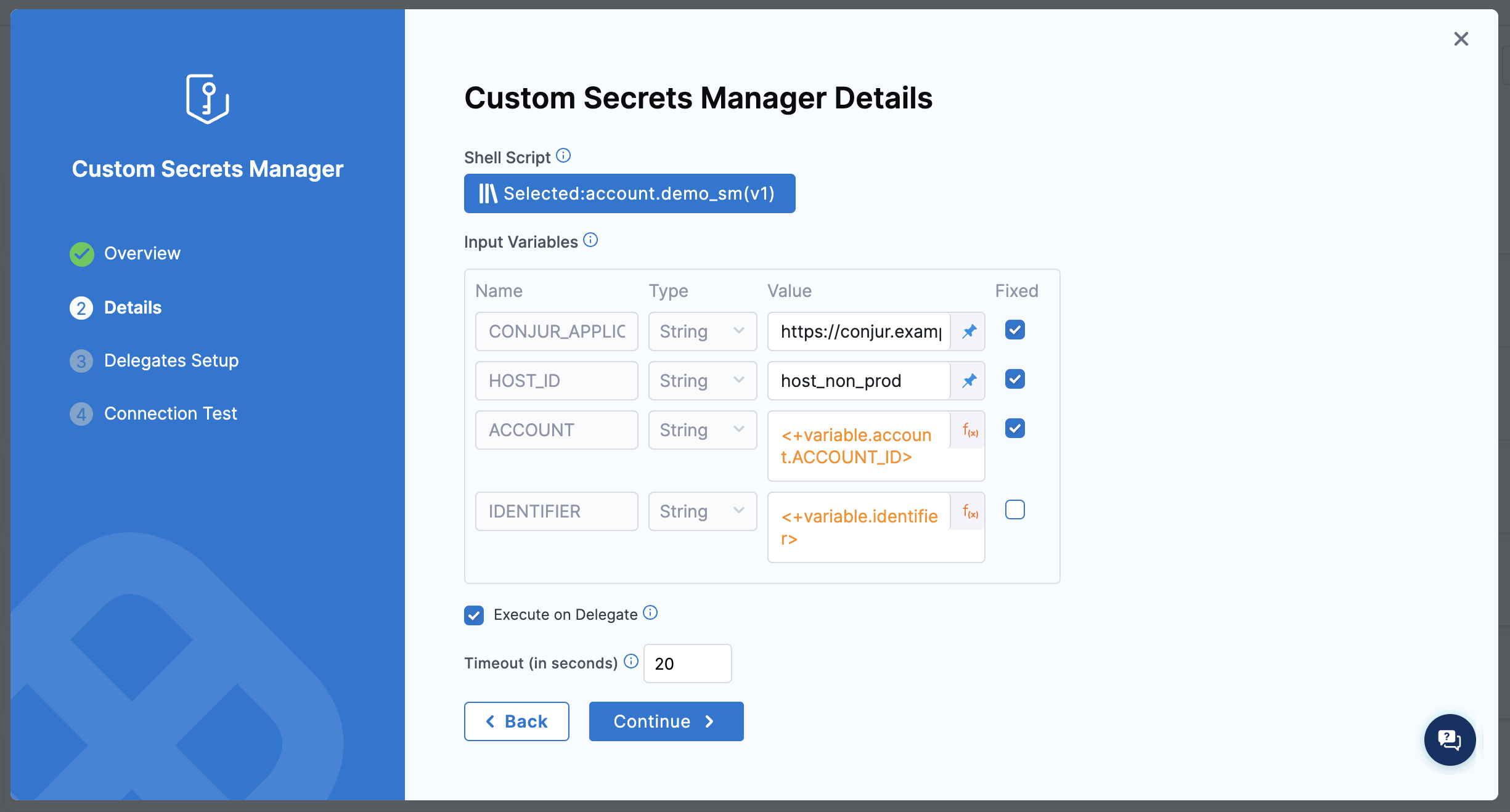 • Select Fixed for the CONJUR_APPLIANCE_URL, HOST_ID, AUTHENTICATOR, API_KEY_SECRET_ID, and ACCOUNT.