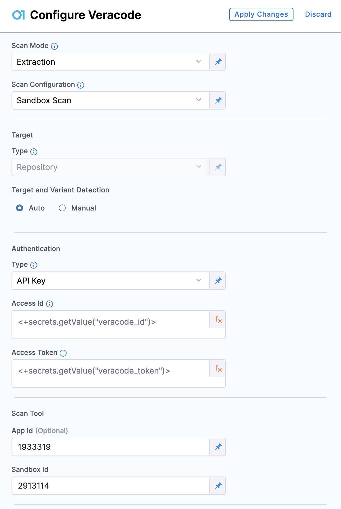 - App Id(optional): In the Scan Tool section, you can provide the Veracode App Id of the application from which you want to fetch scan results. If left blank, the step will try to locate an application using the Target Name you specified. Note that the step can only find applications previously created by STO during orchestration, as it relies on the specific naming convention used by STO. Additionally, refer to this section to learn more on how to use an existing Veracode Application created by STO.