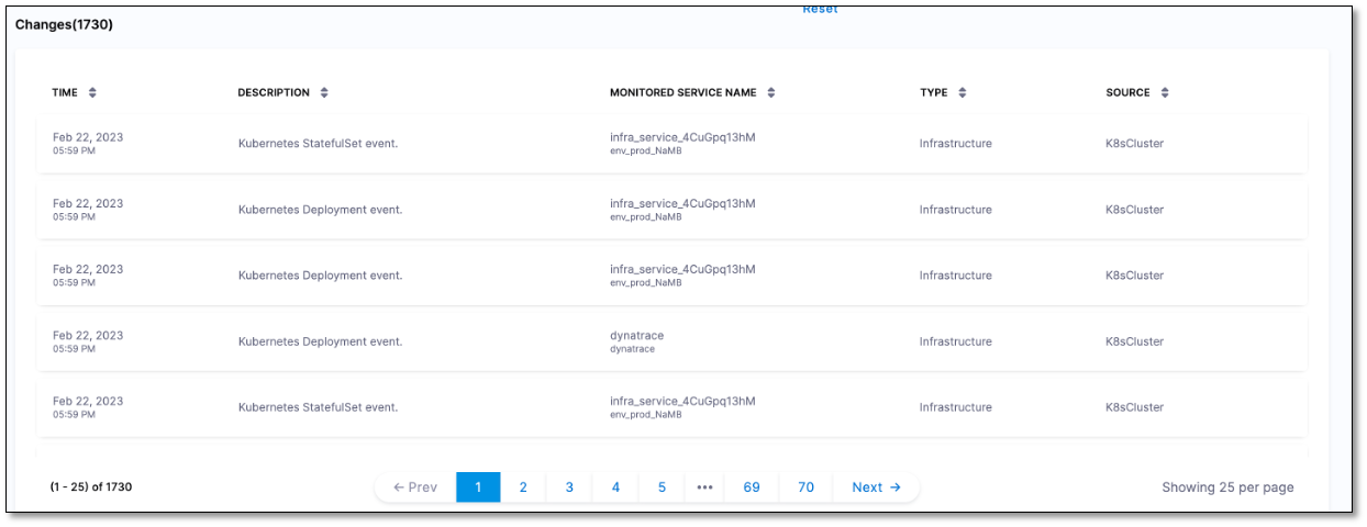 The Changes list displays all the change events along with the following details: