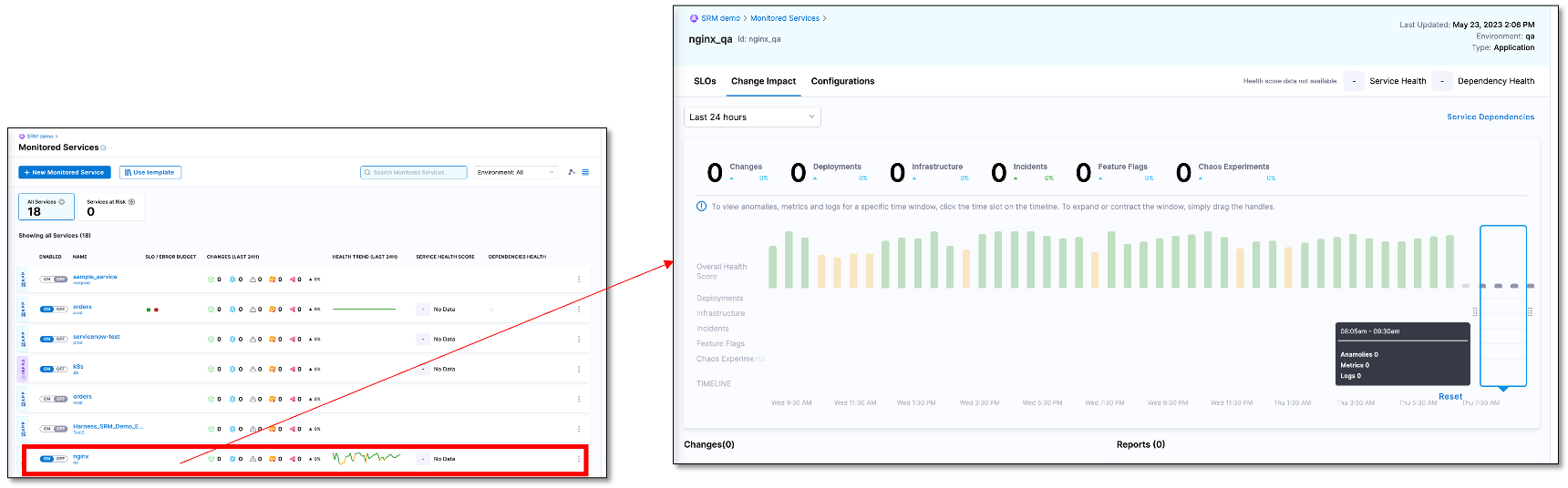 The Change Impact dashboard enables you to observe and track the health of monitored services.