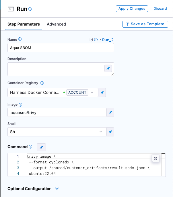 For example, this Run step uses Aqua Trivy to generate an SBOM.